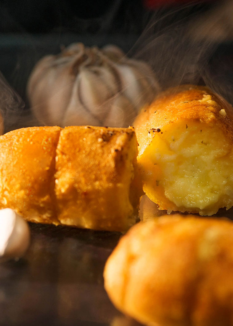 Garlic-bread is a delicacy originating in Italian cuisine and typically consists of some type of bread garnished with a mixture of garlic and olive oil or butter, grilled, toasted or baked in the oven. It can be served as an antipasto, or as an accompaniment to any meal, such as a barbecue